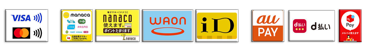 現金はもとより、クレジットカード(VISA、Master card、JCB)、電子マネー(交通系、nanaco、WAON、iD)、QRコード決済(auPAY、D払い、メルペイ)に対応が可能です。